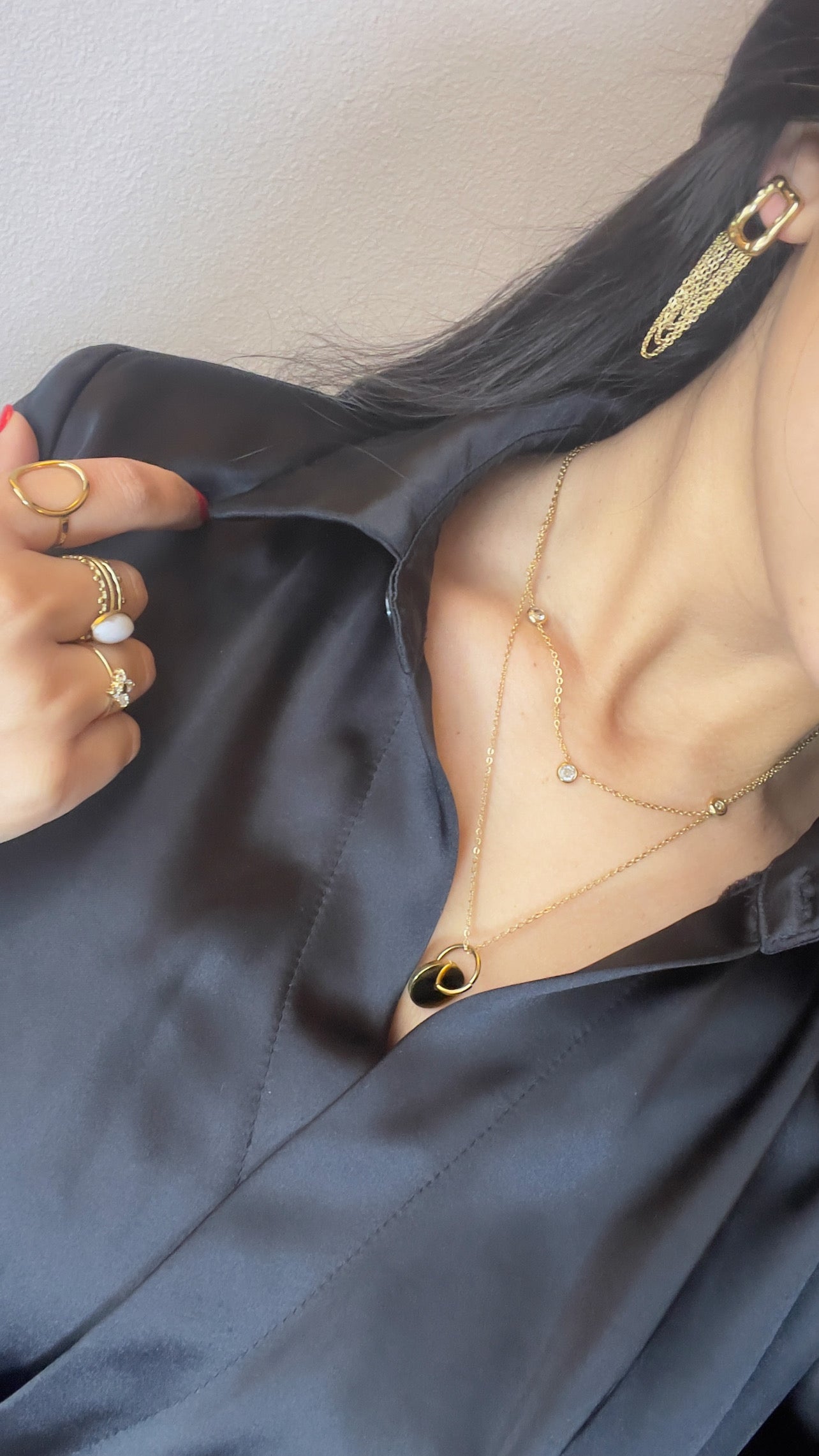 Le collier Orion se distingue par son design double chaîne élégant et moderne. Agrémenté de strass scintillants et d’un pendentif roue délicat, ce bijou en acier inoxydable doré est à la fois résistant à l’eau et intemporel, promettant de ne pas rouiller au fil du temps.